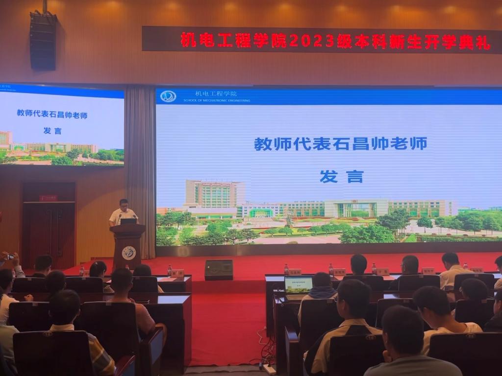 開學典禮上教師代表石昌帥老師、高年級學生代表2021級機械工程吳雨豪和新生代表過程裝備與控制裴中睿先后上臺發言。老師對全體同學的殷切期望、高年級學長的學習生活感悟分享以及新同學對大學生活的無限期待,都深深地感染著現場的每一位師生。