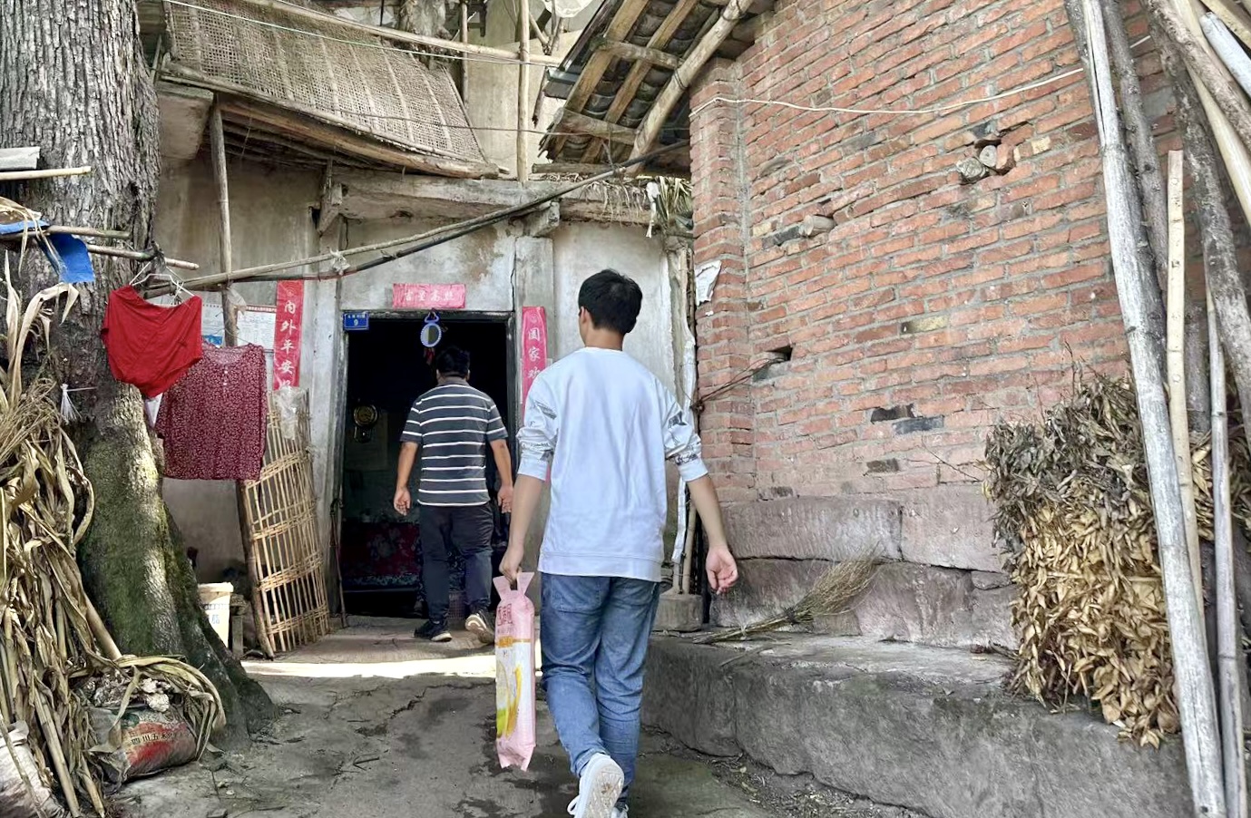 在出發前,志愿者們了解到太陽村地處大山之中,離最近的城鎮也要十公里左右的路程,因此當地經濟比較落后,存在困難戶的情況。為了給當地村民帶去關愛和幫助,志愿者們在村支部帶領下前往最近的鎮上購買油米等物資,然后去到三戶貧困家庭,贈予物資并慰問家庭近況。同時,志愿者也闡明此次行動目的:“振興鄉村 ,志愿基層。”在與貧困戶交談過程中,志愿者們初步了解到導致其家庭生活困難的原因大多與家庭成員的疾病有關,并對離城鎮較遠的交通問題加深了了解,進一步了解到太陽村未來鄉村振興的艱巨性。