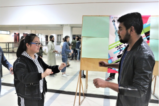 本周四(2018年3月29日)晚上于明志樓二樓大廳前展開了第一期英語角活動。本次活動主要分為:分組交流介紹、你畫我猜小游戲、溝通分享本國美食三個環節。主持人以一首《We are the world》開場,同學們便迫不及待的交流溝通起來。熱情的自我接受,討論時的小玩笑,時而說不準的發音,讓會場的氣氛漸漸暖了起來,也讓大家的距離拉近了幾分。隨后進行的你畫我猜小游戲更是將活動氛圍推至最高點,同學們積極動腦,使盡渾身解數,怪誕有趣的肢體語言,拐彎抹角的英語描述,引得現場笑聲陣陣。在大家都意猶未盡之際,活動第三環節也漸漸展開,大家互相介紹著自己國家和地區的特色美食,還拿出圖片來一起分享,新疆的大盤雞、重慶的酸辣粉、孟加拉國的摩洛哥塔吉鍋等等,看著這些美食不禁讓人垂涎欲滴。活動的最后,我們邀請了每位隊伍的代表對交流內容進行總結發言,評選出最佳交流團隊,頒發特別小禮品。