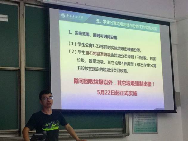 2018年5月17日,輔導員夏天鴻老師在明德樓2017級工業(yè)設計自習室,召開了“學生公寓生活垃圾出樓與分類”的主題宣傳班會。