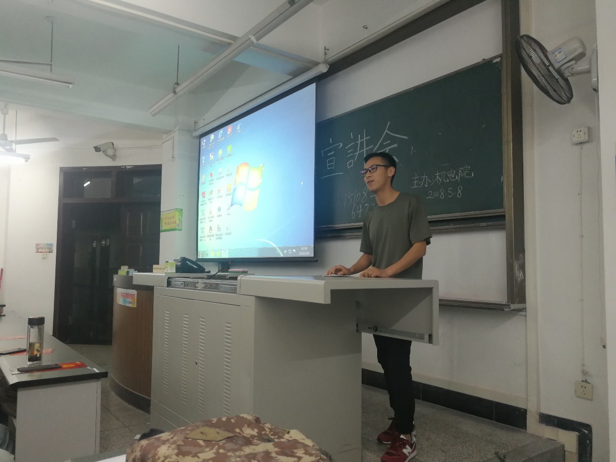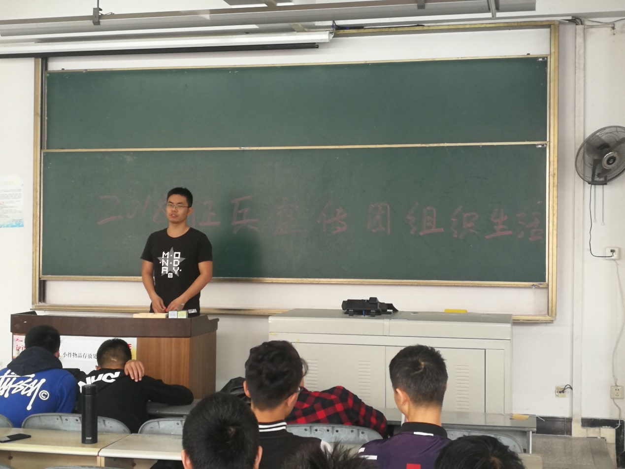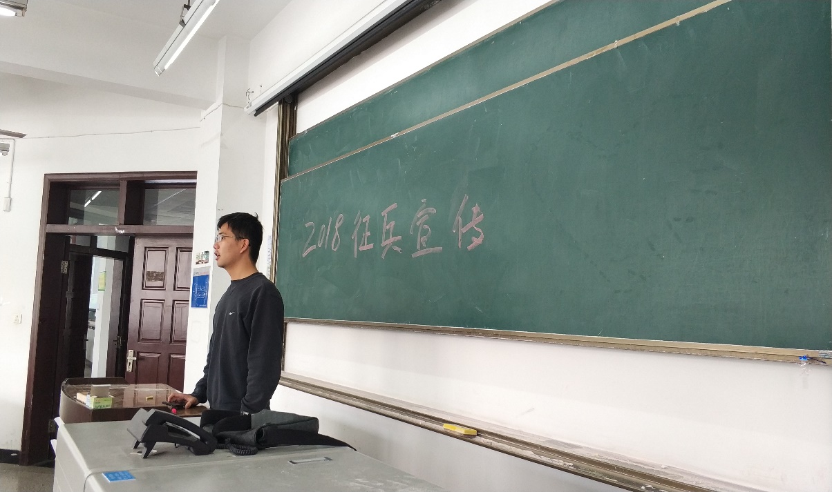 在王老師的講解后,已退伍的兩年兵2015級測控技術與儀器專業的學生鄭伯軍在會上給同學們分享了自己參軍生涯。他回憶了自己在軍營中的點點滴滴,他講道,“當兵雖然很辛苦,但是現在回想起來在隊伍的日子,無論是在精神還是身體上都得到了極大的提升,所有的辛苦都是值得的。當兵后悔兩年,不當兵后悔一生!”