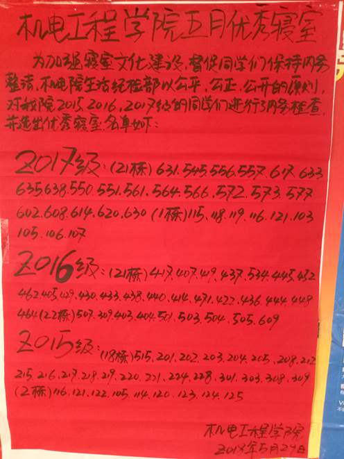 為促進我院學風建設,規(guī)范學生作息和生活習慣,創(chuàng)造良好的學習環(huán)境,提高學習效率,機電院團委、學生會將秉持公平公正的原則,嚴格按照學院統(tǒng)一部署規(guī)定,對機電院寢室內務進行了檢查并選出五月份優(yōu)秀寢室名單如下: