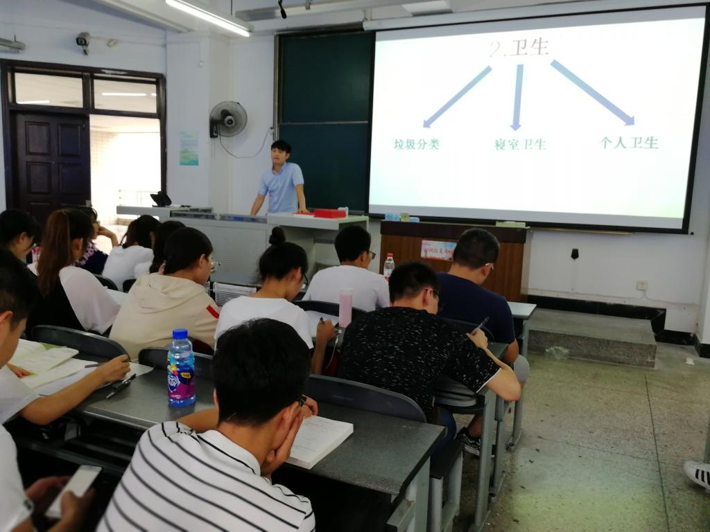 接著,對于近期開始在全校范圍內實行的“垃圾分類”措施,伍老師叮囑同學們一定要一起行動起來,做好垃圾分類,愛護衛生,積極保護環境。然后,伍老師便提到了最重要的安全問題,因為臨近本科生畢業和世界杯的舉行,所以他叮囑班委們一定要在晚上準時查人數并上報給輔導員,同時也告誡同學們,安全問題無小事,要時刻處處留心。
