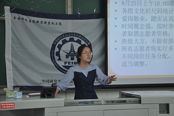 中國(guó)研究生石油裝備設(shè)計(jì)大賽旨在于提高中國(guó)研究生的創(chuàng)新能力,加強(qiáng)各石油高校之間的聯(lián)系,對(duì)于各大石油院校來(lái)說(shuō),是極為十分重要的比賽。此次賽事我校作為主辦方,更是可以以此為契機(jī),展現(xiàn)出我校的精神風(fēng)貌。面對(duì)如此重要的活動(dòng),志愿活動(dòng)在比賽是必不可缺的,志愿者培訓(xùn)的舉辦更是對(duì)賽事的順利舉行具有積極的意義。