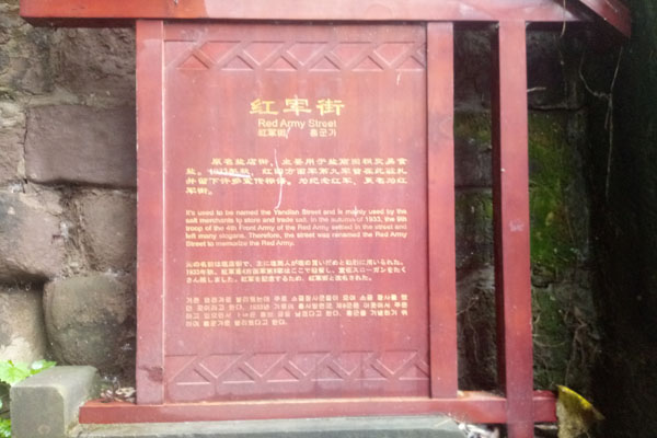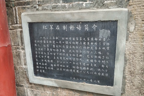 一入古鎮,便被它極強的代入感所折服。雖然周遭市井氣息濃厚,但古鎮卻絲毫不受影響,樸素的建筑,白墻黑瓦,淳樸的民風,無不讓我感到親切。走進古鎮的第二條街便是紅軍街,街口的紅色木牌上有關于紅軍街的由來:“原名鹽店街,主要用于鹽商囤積交易食鹽。1933年秋,紅四方面軍第九軍曾在此駐扎并留下許多宣傳標語。為紀念紅軍,更名為紅軍街。”街頭結尾各放置一個石缸,歲月磨平了它的棱角,苔蘚覆蓋了它的全身,刨去部分苔蘚,可以看見缸上刻著的人像,像是講述著一個故事,但是什么樣的故事,我們卻不得而知。街尾的紅軍石刻標語簡介也向我們訴說了一段壯烈的歷史……