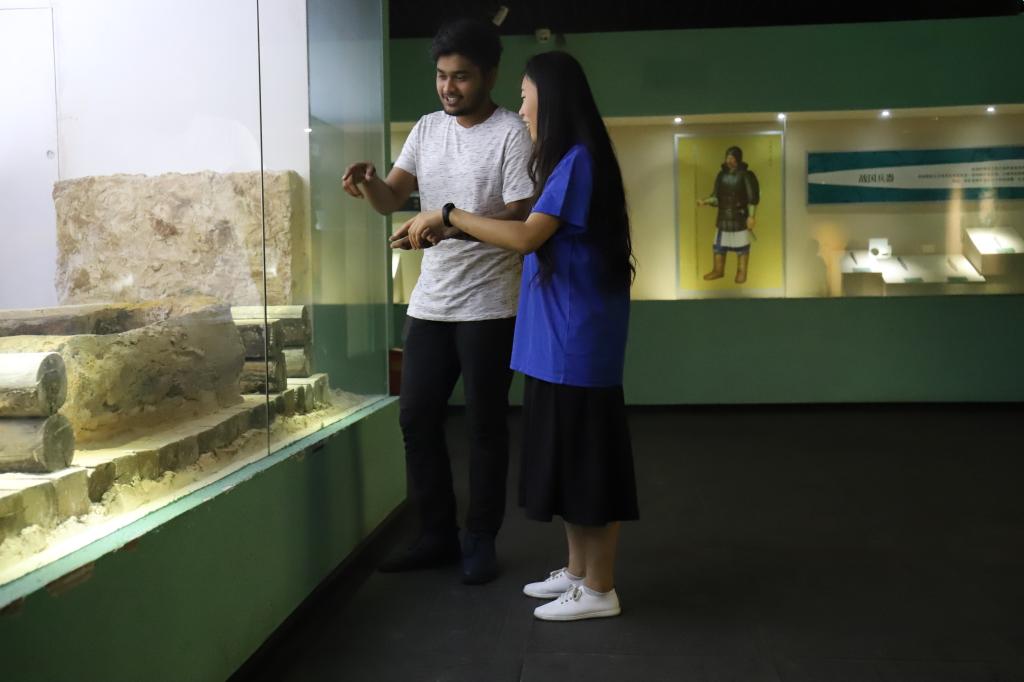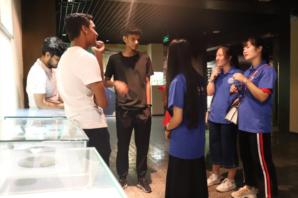 出發不久后,團隊便到達了目的地——新都博物館。實踐隊隊員將早已準備好的博物館英文簡介贈給了留學生,并在參觀過程中用英語為留學生介紹館中的各種文物以及其所代表的文化意義。在博物館中,團隊成員與留學生互相交流著兩國的文化,在一些具有中國特色的物品上,如當觀覽到館中所陳列的佛祖石雕前時,我們進行了詳談,其中提及各國都應該尊敬彼此的文化。在參觀的過程中,大家逐漸了解了兩國文化的不同之處,也為促進兩國文化交流盡了份努力。