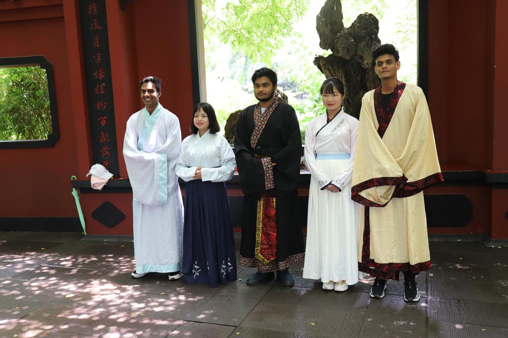 與留學生共進午餐期后,大家來到了桂湖公園。剛進公園,我們便與留學生共著漢服,進行漢服文化體驗,這也為接下來的實踐采訪活動做了準備。穿漢服使留學生們興趣蓬勃,合照留影后大家邁入古亭中,圍坐著交流此行的感受以及體驗。