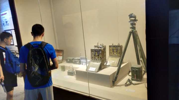 首先,我們實踐隊員進入了防空洞,這里潮濕,陰冷。防空洞十分長,也很寬廣,周圍兩側張貼著標語,一些墻角擺放著武器模型,防毒面具,關于核能知識,細菌防護知識的海報。其中,詳細介紹了原子彈,氫彈等一系列核武器對于人類的危害,并附上了日本長崎,廣島被原子彈侵襲過后的圖片,里面的悲慘現狀讓我們實踐隊員感到核戰爭對于人類的毀滅性傷害。