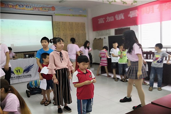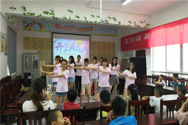 7月11日的富加鎮,風雨依舊,但義縷曦柚的實踐隊員們還是滿懷熱情的去上課地點迎接孩子們。上午九點,待到可愛的孩子們一一入座,我們正式進行了“快樂學校”的開班儀式。