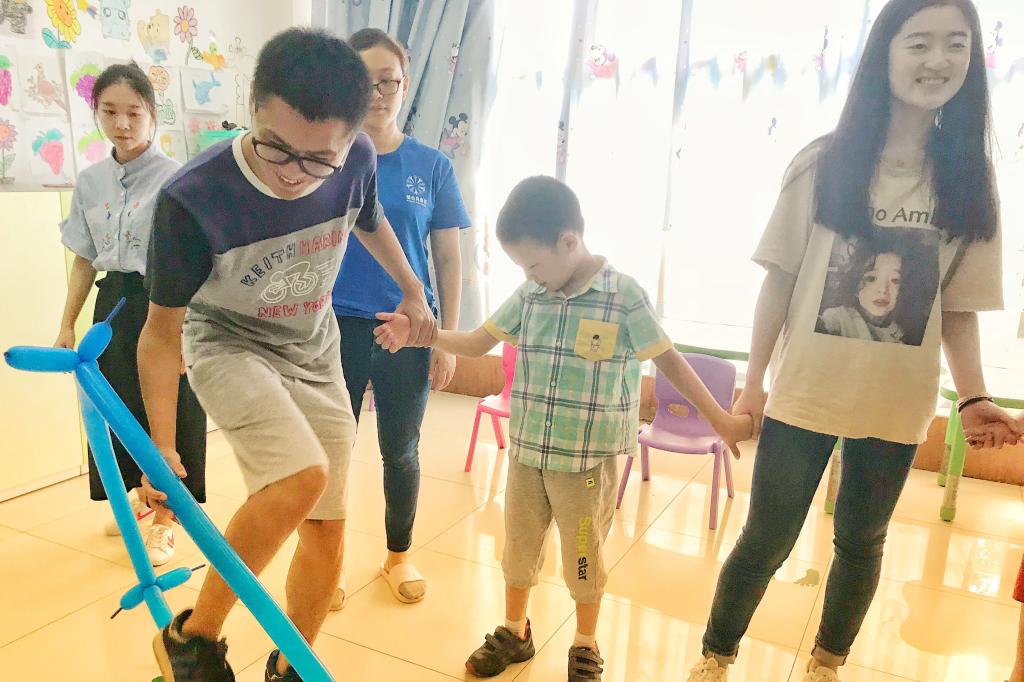 第二個活動是“穿過氣球”,我們用三條長條氣球做成足夠大的三角形造型,然后活動中我們和老師、家長、孩子們手拉手圍成一個大圈,然后依次變化身體造型從三角形中穿過去,大部分孩子們都很聽話,會主動抬腿然后穿過氣球圈。有些孩子們確定不好著地點穿不過去,我們就會不斷示范動作給他們看,然后他們也能模仿著穿過去。還有些孩子不愿意參加活動或是參加到一半跑走了,我們會和老師、家長們一起給他們做心理輔導告訴他們先做完活動再去玩(老師們說當自閉癥兒童不愿意合作接受教育時要盡可能地和他們進行交流溝通,不管用眼神還是動作,首先要讓他們注意到你)。這個活動結束后我們的感觸很大,只要和自閉癥兒童心貼心、不斷交流、保持耐心,他們還是會明白自己要做的事。