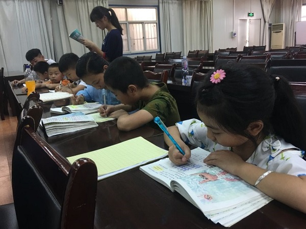孩子們?cè)陉?duì)員的輔導(dǎo)下認(rèn)真完成作業(yè)