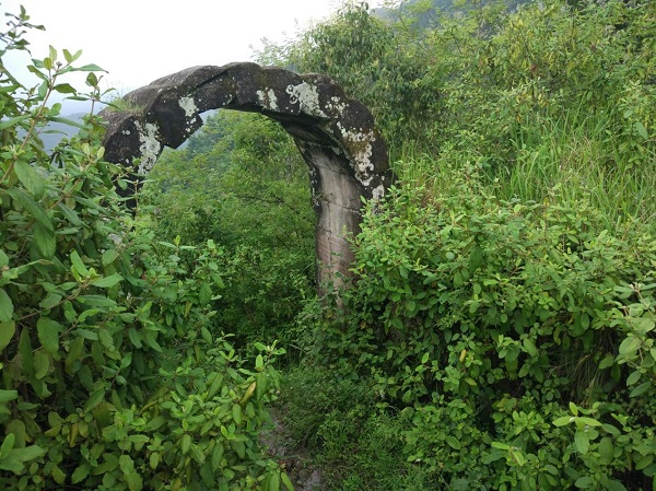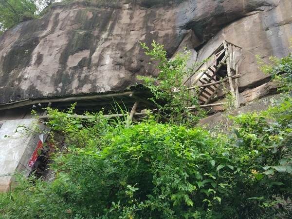 根據我們的了解“銅鼓寨是在明代以前建村的,當地村民介紹,當年張獻忠入川,燒殺搶掠,當地民眾為了避難,合力在山上修建起了城墻和東、西、南、北四道寨門,但在時間的作用下堅固的城墻毀于一旦。”我們艱難的跋涉了一段路程,終于找到了剩下的一道寨門的。寨門周圍雜草叢生,當年的風光早已不現。同時,銅鼓寨山勢險要,在山上也進行剿匪活動。當年紅軍為攻下此寨激戰三天三夜。“1933年10月22日,以唐博安、楊發清為首的匪徒在豐竇鋪戰敗后,率部負隅頑抗。為了消滅殘余勢力,10月23日,紅二十五軍和二十七師各一部,兵分兩路向銅鼓寨進發,經過激烈的戰斗,一舉攻下銅鼓寨,此后,紅軍又在多地進行戰斗,終于解決了蓬安的匪患。”我們懷著敬仰的心情瞻仰了“銅鼓寨遺跡”。這里的每塊石頭都經過時間的洗禮,默默無聲,似乎在述說著當年戰斗的艱辛。撫摸著石頭上深深淺淺的彈孔,感慨萬分。在返航的時候,在當地的人幫助下,我們找到當年的“土匪洞”,據村里面的人介紹,這個洞可以容納幾十號人。由于建筑年代久遠我們并沒有入洞,只是在外面看了看,就離開了。