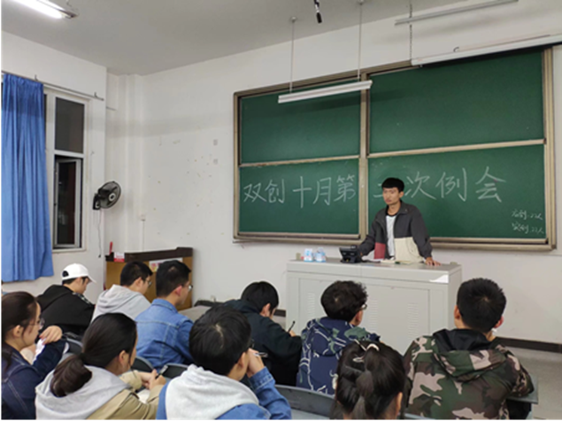 例會開始,首先由陳歡部長強調說明了例會請假的步驟以及即將到來的趣味運動會相關事項,接著對上周院運動會開幕式中由雙創負責的彩旗隊的表現進行了總結。緊接著顏鑫部長上臺發言,說明了即將舉行的科技知識競賽的相關事項并指定了負責主持、拍照以及撰寫新聞稿的委員,同時強調這是一次很重要的活動各委員應當重視。之后又指定了負責撰寫十月總結、十一月計劃以及本次例會記錄的委員。接著彭俊杰部長與嚴宇杰部長分別上臺發言,就部門考核分數的相關事項進行說明并對委員們提出了新的要求,同時又強調部門的官q應該再活躍些,多轉發一些正能量的說說。在二位部長發言完畢后,熊棲部長上臺就委員們在之前工作中存在的問題進行了說明并對委員們嚴格要求,同時也敦促大家應提高對部門事務的積極性。最后吳霜部長上臺發言,就查課相關事項進行了說明。