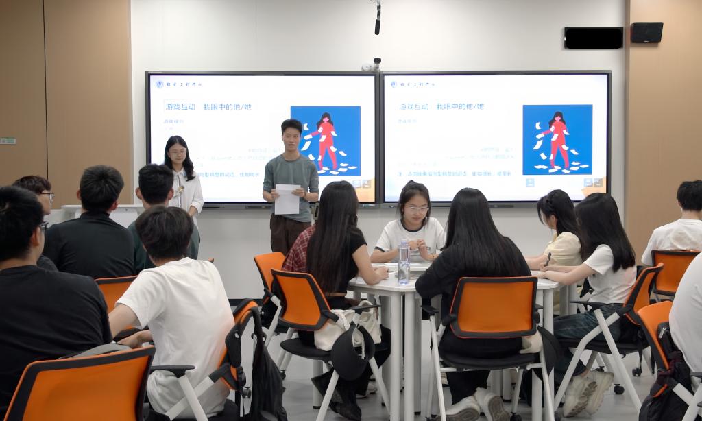 主題班會(huì)設(shè)置了多個(gè)環(huán)節(jié),分別有知識(shí)講授、心理微視頻科普、游戲互動(dòng)和案例交流,班會(huì)全程由徐敏航老師主持。徐老師向同學(xué)們分享了常見(jiàn)的寢室人際關(guān)系困擾類型、困擾產(chǎn)生的原因以及解決對(duì)策。在“個(gè)性名片”游戲環(huán)節(jié)中,同學(xué)們?cè)谥驹刚叻职l(fā)的卡片上匿名書(shū)寫(xiě)個(gè)人特征,多名同學(xué)積極交流分享自己抽到的匿名卡片,并識(shí)別出相關(guān)同學(xué),現(xiàn)場(chǎng)氣氛輕松有趣,爆發(fā)出一陣陣笑聲。在案例交流環(huán)節(jié),同學(xué)們一起分析交流寢室矛盾案例,并嘗試用非暴力溝通的方式進(jìn)行語(yǔ)言表達(dá)。