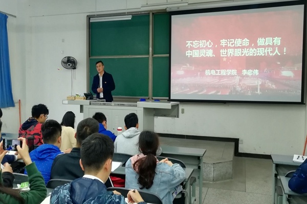 為加強新黨員對黨的深刻認識,激勵青年學生樹立崇高的理想和信仰,扎實推進“不忘初心,牢記使命”主題教育有力有序開展,2019年10月24日下午,機電工程學院黨委開展主題黨課,我院2019級新生黨員、預備黨員以及擬發展對象參加此次黨課,學院黨委書記李忠偉以“不忘初心,牢記使命,做具有中國靈魂、世界眼光的現代人”為主題為參會同學上了生動一課。
