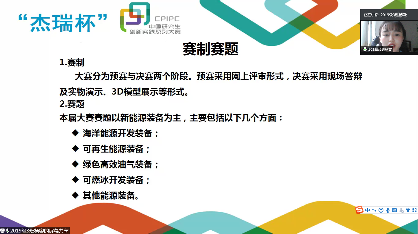 會上,主持人楊容同學為同學們詳細介紹了本屆大賽,能源裝備創新設計大賽為“中國研究生創新實踐系列大賽”主題賽事之一,本屆大賽以新能源裝備為主,涵蓋了海洋能源開發、綠色高效油氣、風能、太陽能等多種類能源裝備的創新設計。緊接著,由往屆大賽獲獎團隊的四位代表分別進行發言。2018級李紅強同學對大賽流程和要求進行了講解;2018級代繼樑同學對大賽報告的撰寫方式、答辯注意事項、所需準備材料,以及參賽中遇到的特殊情況應對方法等進行了講解;陳科同學帶領大家回顧了賽事流程,為同學們分析了評委打分規則;何靈同學則給大家分享了他們團隊的參賽經驗,并強調團隊合作和時間規劃在比賽過程中的重要性。會議最后,同學們向分享比賽經驗的團隊代表進行提問,優秀團隊代表同學為大家積極答疑解惑。