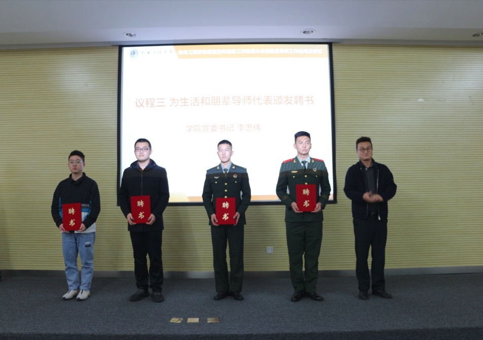會(huì)上,學(xué)院聘任蒲勇部長(zhǎng)和張維書記擔(dān)任駐樓“思想引領(lǐng)導(dǎo)師”,聘任宋震主任和蔡燦博士擔(dān)任駐樓“專業(yè)學(xué)科導(dǎo)師”,聘任退伍軍人和畢業(yè)生黨員干部擔(dān)任“生活勞動(dòng)導(dǎo)師”和“黨員朋輩導(dǎo)師”。同時(shí),邀請(qǐng)校團(tuán)委副書記張維為學(xué)生公寓7位樓長(zhǎng)頒發(fā)聘書,學(xué)院黨委副書記姚偉寧為學(xué)生公寓19位層長(zhǎng)代表頒發(fā)聘書,落細(xì)落實(shí)學(xué)生社區(qū)自治管理。
