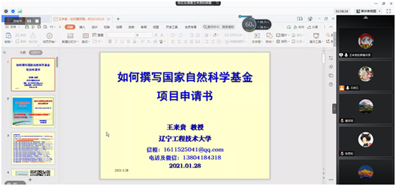 1月28日上午9:00在騰訊會議室,應學院邀請,遼寧工程技術大學二級教授王來貴老師為我院舉辦“如何撰寫國家自然科學基金項目申請書”講座。學院院長祝效華、院長助理張杰以及來自機電院、石工院、地科院、理學院等157名教師參與,講座由學院副院長石明江主持。