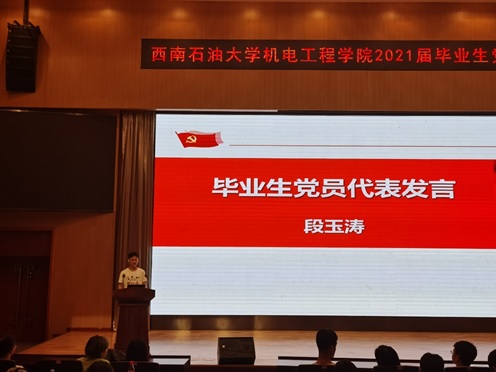 機械工程2017級畢業生段玉濤同學作為黨員代表發言。他回顧了四年大學生活,總結了自己在思想、學習、工作、課余生活中所取得的成績和感悟,展望了即將開啟的人生新征程,表達了對黨組織、母校、學院、老師們的感謝之情。