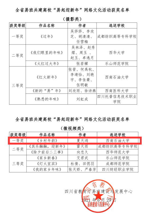 6月29日,2021年四川省易班共建高校“易起迎新年”網絡文化活動獲獎名單公布。我院夏天鴻老師創作的微視頻《鄉村年韻》獲得微視頻類唯一的一等獎。