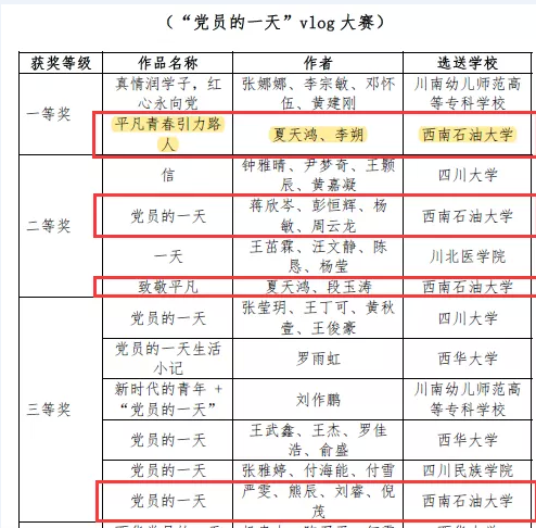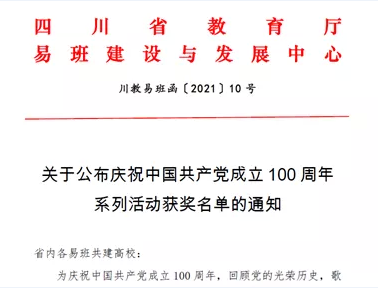 9月30日,四川高校網絡思想政治工作中心、四川省教育廳易班建設與發展中心公布了四川省易班共建高校慶祝中國共產黨成立100周年系列活動獲獎名單。我院選送的作品獲得一等獎1項、二等獎1項、三等獎1項、優秀獎1項,獲獎數量和質量位居全校前列。