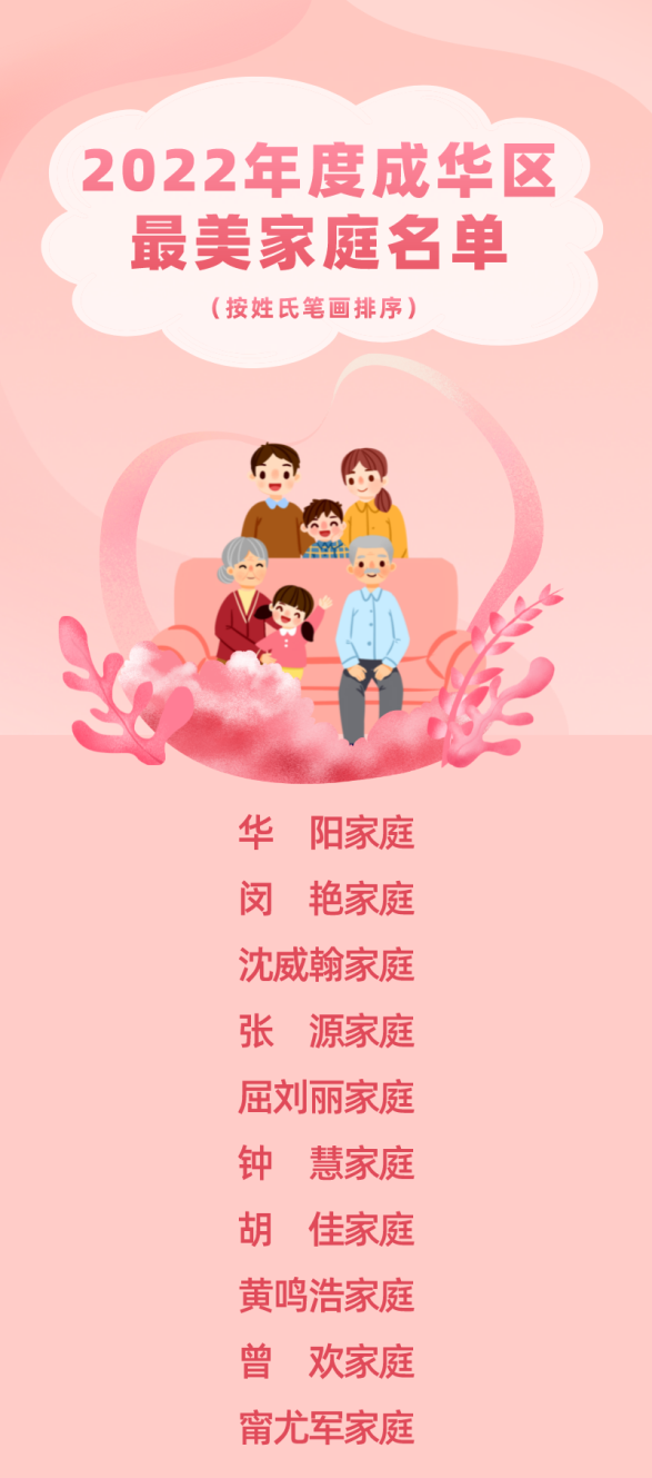 此項(xiàng)活動(dòng)通過(guò)成華區(qū)組織推薦、家庭自薦、網(wǎng)絡(luò)投票、綜合評(píng)審、黨組評(píng)議,最終評(píng)選出甯尤軍等10戶成華區(qū)2022年度“最美家庭”,王晶晶等10戶成華區(qū)2022年度“最美家庭”提名家庭,并予以通報(bào)表?yè)P(yáng)。