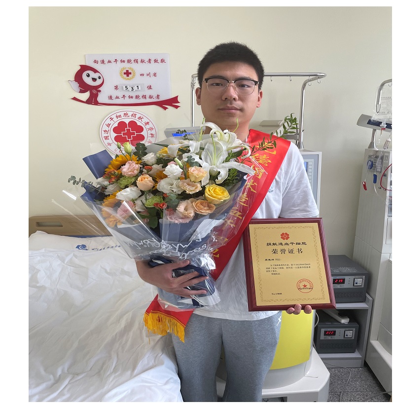 英曉洋是一名研究生,一名退役軍人,一名中共黨員。在本科和研究生期間,無償獻血14次,全血總獻血量達1500ml、血小板總獻血量達20治療量。2022年4月28日,英曉洋接到四川省紅十字會通知,得知自己與一名外省的白血病患者造血干細胞配型成功,他沒有遲疑當場就表示愿意捐獻,并配合開展高分辨分型檢測。為了確保捐獻成功,在忙碌的學習、工作之余,積極進行捐獻前的各項準備工作。HLA高分辨配型成功和體檢合格后,他堅持調整飲食、作息,堅持鍛煉,以良好的身體狀態等待采集的這一天。從9月2日開始,英曉洋入住四川省人民醫院血液內科,連續5天進行9次動員針注射,每天抽血檢測白細胞濃度,為捐獻造血干細胞做最后準備。9月6日,成功將造血干細胞捐出,其中懸浮液252毫升。
