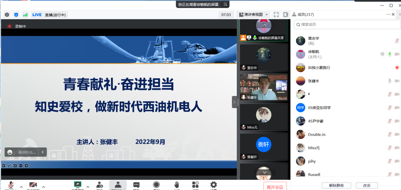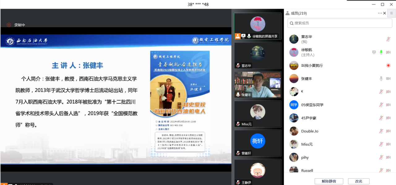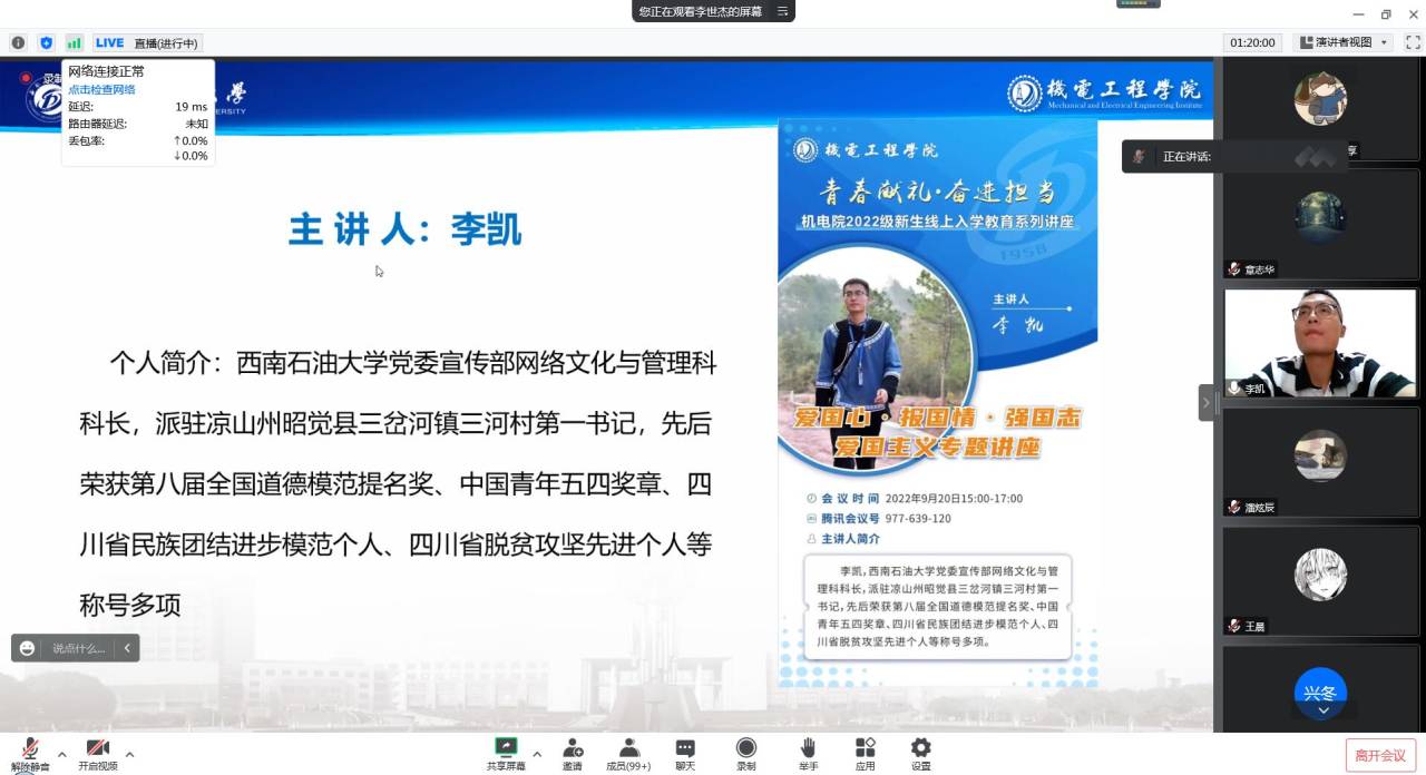 為加強學生愛國主義教育,幫助學生樹立社會主義核心價值觀,弘揚民族精神。9月19日上午10點和9月20日下午15點,我院分別邀請到馬克思主義學院張健豐教授和黨委宣傳部網絡文化與管理科科長李凱老師,在線上開展了以“知史愛校,做新時代西油機電人”、“愛國心 報國情 強國志”為主題的新生入黨引領及愛國主義教育講座。