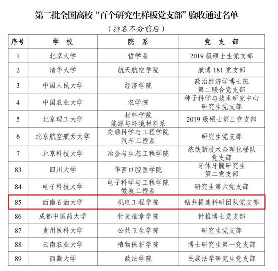 7月6日,教育部思想政治工作司公布了第二批全國高校“百個研究生樣板黨支部”和“百名研究生黨員標兵”創建培育工作驗收結果的公示通知,經支部對標自查總結、校黨委審核、省教育工委把關審核、教育部思想政治工作司審查及相關公示,我院鉆井提速科研團隊黨支部順利通過第二批“全國黨建工作樣板支部”培育創建單位驗收。