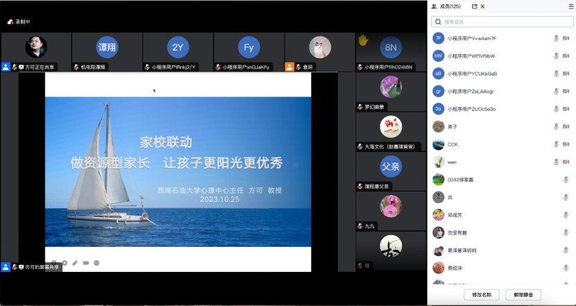 為引導(dǎo)2023級(jí)新生家長(zhǎng)關(guān)注自身與孩子的心理健康狀況,充分推動(dòng)家校協(xié)同合作,10月25日晚上七點(diǎn),機(jī)電院“家校聯(lián)動(dòng)——做資源型家長(zhǎng),讓孩子更陽(yáng)光更優(yōu)秀”主題講座于騰訊會(huì)議成功舉辦。學(xué)院邀請(qǐng)了我校心理發(fā)展與服務(wù)中心主任方可做主講老師,由2023級(jí)新生輔導(dǎo)員袁玥主持,各班新生家長(zhǎng)通過(guò)網(wǎng)絡(luò)直播的方式有序收看講座,家長(zhǎng)們以積極的態(tài)度認(rèn)真學(xué)習(xí)講座內(nèi)容,獲益良多,收效甚佳。