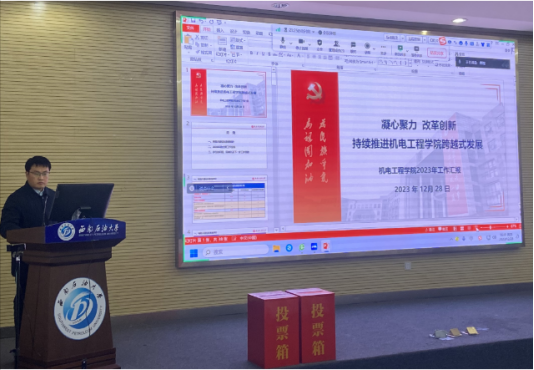 會議第二階段,學院院長韓傳軍代表學院領導班子對機電工程學院2023年年度情況向全院教職工和學生代表進行了匯報。韓傳軍院長從教學工作、科學研究、師資隊伍、學生培養、學科競賽、實驗室工作等方面進行了匯報和總結,他指出過去一年學院的各項工作取得了長足進步,多個方面取得了新的突破,他明確了未來學院工作方向與重點,希望全體教職工凝心聚力,砥礪奮進,完成學校下發的各項任務,助力學院高質量發展。同時,他也指出了目前學院存在的不足,希望學院各單位在2024年進一步加強協作,共同補齊短板。