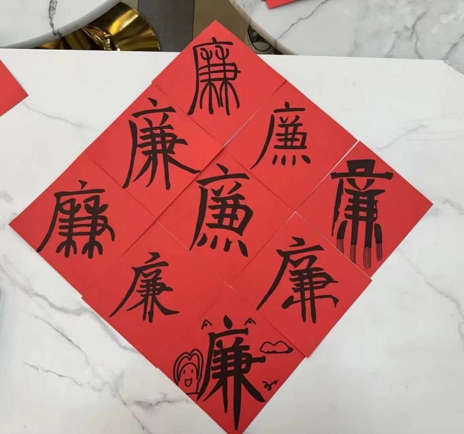 書法是中國傳統文化的瑰寶,也是傳遞廉潔精神的重要載體。在“寫廉字”環節,同學們現場揮毫潑墨,在紅紙上用心寫下“廉”字,把對“廉”的理解與敬畏融入到一筆一劃中,以精巧的構思傳遞廉潔文化。“談廉感”環節是本次活動的高潮部分,同學們依次上臺分享自己的感悟,紛紛表示這個端午節過得“廉”味十足,不僅增進了對廉潔文化的理解和認同,還激發了共同建設廉潔校園的熱情。最后“送廉粽”環節,參與者將親手制作的粽子和廉卡分送給同學們,寓意著廉潔文化的傳遞。這不僅是一份端午節禮物,更是一份對廉潔精神的弘揚和傳承。