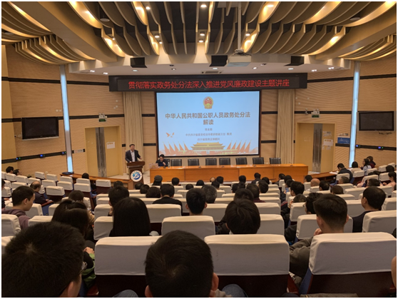 胡業(yè)勛以《貫徹落實公職人員政務處分法深入推進黨風廉政建設》為題,闡述了“政務處分法”頒布的背景和意義,詳細解讀了其主要內(nèi)容、適用規(guī)則及程序。他結(jié)合大量的典型案例、經(jīng)歷的法律案件,用專業(yè)的視角、嚴謹?shù)恼撟C、平實的語言,深入淺出給學院教職工、學生黨員作了一堂精彩的報告,報告具有很強的針對性、教育性和指導性。