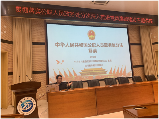 為進一步加強黨風廉政教育,引導師生黨員認識和把握黨風廉政建設面臨的新形勢新任務新要求,增強紀律意識、規(guī)矩意識。11月12日14:30,學院邀請中共四川省委黨校法學教研部副主任胡業(yè)勛教授來院作廉潔專題講座。學院黨委副書記、紀委書記姚利主持講座,學院全體教師、學生黨員代表在思學樓A114報告廳聽取了講座。