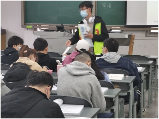 疫情防控監察小組按照課程進行緊急排班,前往學院學生課程教室,檢查同學們的課程到勤率和口罩佩戴情況。在明志樓大廳,疫情防控監察小組認真檢查出入師生是否嚴格佩戴口罩,給未戴口罩的師生分發口罩。進入教師辦公室、學生實驗室等疫情防控重地,檢查口罩、消毒液等各項疫情防控措施是否落實。
