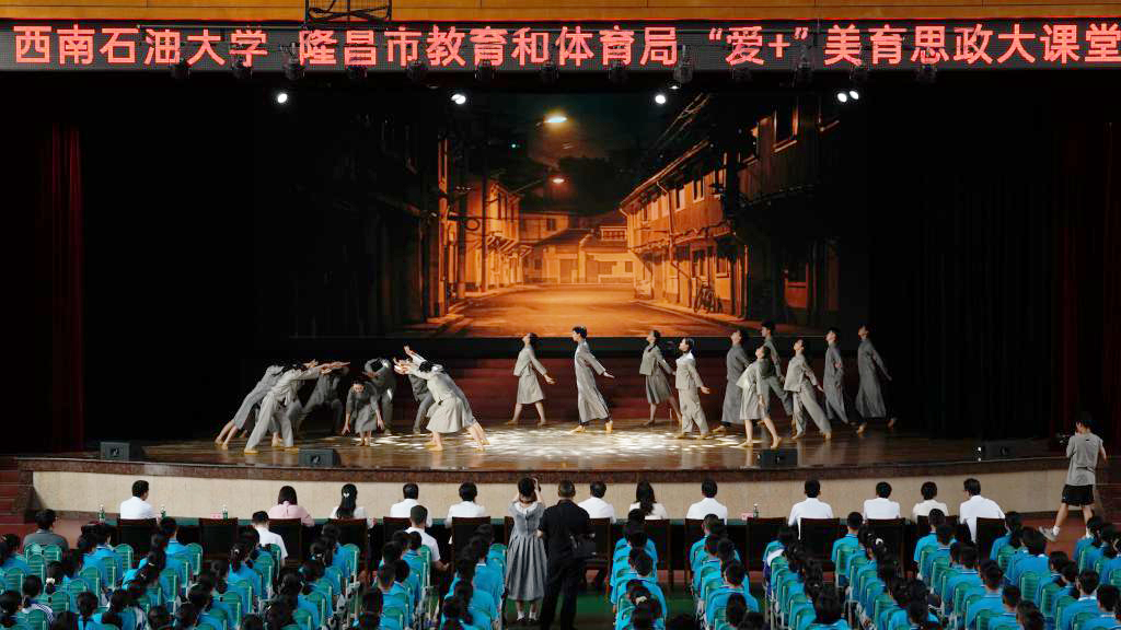 “愛+”美育思政課是我校貫徹落實習近平總書記關于大中小學思政教育一體化重要論述、落實立德樹人根本任務和美育浸潤行動的重要舉措。本次美育思政課由我校藝術學院、馬克思主義學院和隆昌市教體局共同舉辦,隆昌一中教師、學生及家長代表600余人現場觀課。在課堂上,隆昌知行中學教師陳華講述了作為一名軍嫂“責任擔當立家,潤物無聲傳承”的家風故事,美育教研室教師陳煥玲深情演唱《妻子》道出軍嫂的驕傲自豪,播音專業教師關航通過脫口秀的方式分享了自己的小家故事,隆昌一中學生鄧予涵演講《致少年》用聲音傳遞正能量,編導表演專業教師王璇現場作畫《蓮》向隆昌一中獻禮,教師楊閻蕓輝通過琵琶和阮兩種傳統樂器彈奏《唱支山歌給黨聽》《如愿》,隆昌市城關職業中學的同學們用舞蹈《莊嚴的宣誓》堅定著愛國愛家的決心,展現了新中國成立75周年中華民族取得的輝煌成就,AI科普視頻《油然而生》帶領全場簡要認識了石油從形成到開采再到應用的過程。