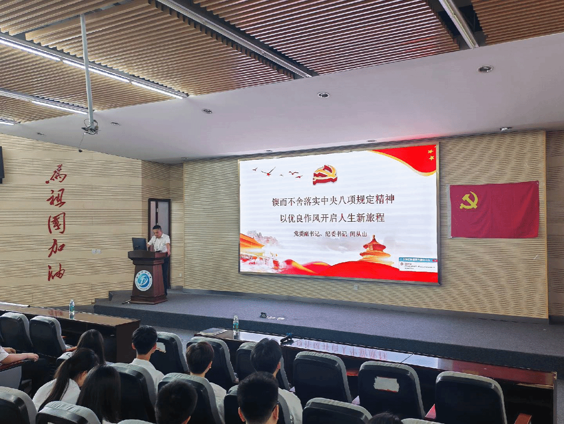 2025年6月12日,電氣信息學院黨委副書記、紀委書記閏從山以“鍥而不舍落實中央八項規定精神 以優良作風開啟人生新旅程”為主題,為學院畢業生黨員、新發展黨員及新轉正黨員帶來了一場深刻的作風建設專題教育。此次宣講結合黨的理論精髓與實踐案例,為青年黨員系好政治生涯“第一粒扣子”。