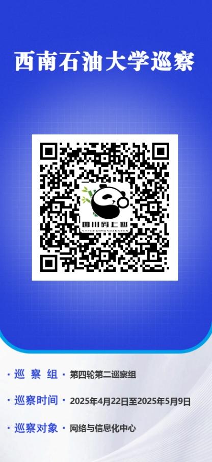 按照校黨委要求和巡察工作領導小組安排,校黨委第二巡察組從2025年4月22日至5月9日對網絡與信息化中心黨總支開展巡察。根據巡視工作條例和《中共西南石油大學委員會巡察工作辦法》規定,巡察組巡察期間受理反映網絡與信息化中心領導班子及成員、下一級黨組織主要負責人等干部問題的來信來訪,重點是關于違反政治紀律、組織紀律、廉潔紀律、群眾紀律、工作紀律、生活紀律以及違反中央八項規定精神方面的舉報和反映。對其他與巡察工作無直接關系的個人訴求,轉交被巡察單位和有關部門處理。師生員工如有舉報和反映問題的,可以通過電話、電子郵箱、掃描“四川碼上巡”二維碼等渠道與巡察組聯系。