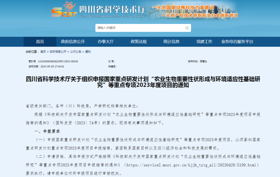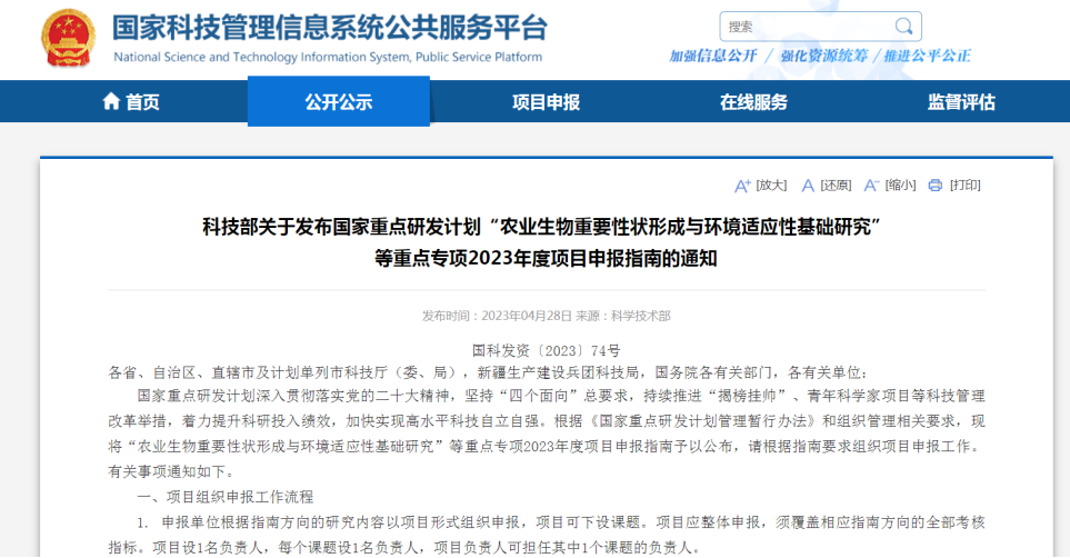 科技部關(guān)于發(fā)布國家重點(diǎn)研發(fā)計(jì)劃“農(nóng)業(yè)生物重要性狀形成與環(huán)境適應(yīng)性基礎(chǔ)研究”等重點(diǎn)專項(xiàng)2023年度項(xiàng)目申報(bào)指南的通知
