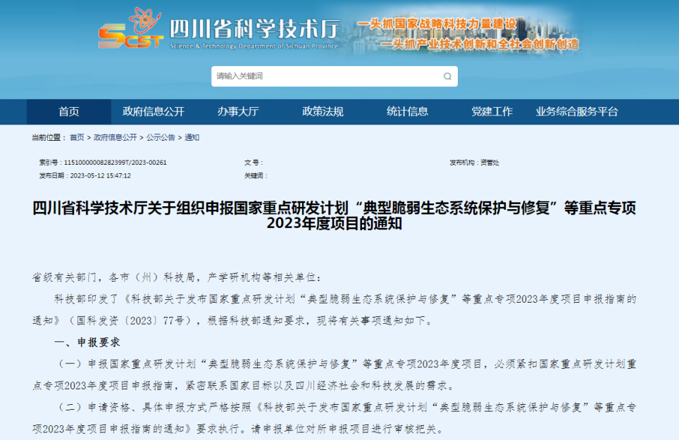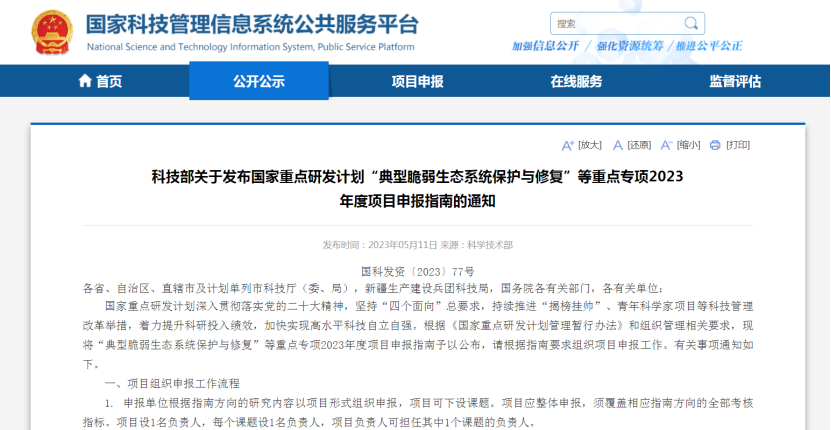 科技部印發了《科技部關于發布國家重點研發計劃“典型脆弱生態系統保護與修復”等重點專項2023年度項目申報指南的通知》(國科發資〔2023〕77號),根據科技部通知要求,現將有關事項通知如下。