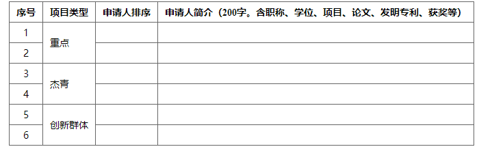 1.各理工學院截止于8月23日前參照全校限項指標(不包括重點實驗室,重點3項、杰青8項、創新群體6項),填寫以下申報計劃表,統一交科研院擇優遴選后通知學院正式申請人名單。
