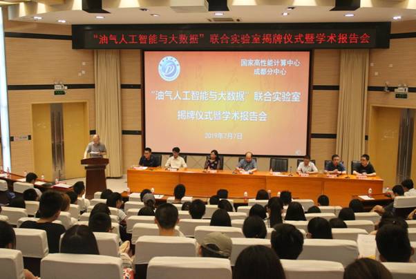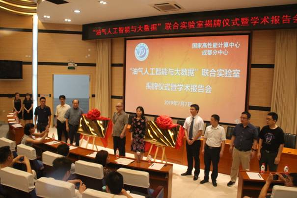 致辭結束后,西南石油大學科研處副處長何蘇,人工智能研究院院長閔超與國家高性能計算中心(成都分中心)主任石勇,常務副主任何靜為“油氣人工智能與大數據聯合實驗室”揭牌。