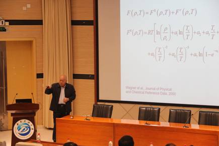 賈教授先分別介紹了目前國際上著名的分子勢能模型:Morse勢能模型、Rosen-Morse勢能模型、Manning-Rosen勢能模型、P?schl and Teller等勢能模型,并深入分析了各勢能模型的不足。賈教授根據各勢能模型的不足,對主要的Tietz勢能模型、Morse勢能模型、Lennard-Jones勢能模型進行了修正。修正后的模型能精準預測物質的相關熱性質,并成功用于在油氣開發。賈教授發表的論文在國際上得到廣泛關注和引用。會后賈教授與師生作了深入交流,與會代表對其報告給予了熱烈歡迎與高度贊揚。