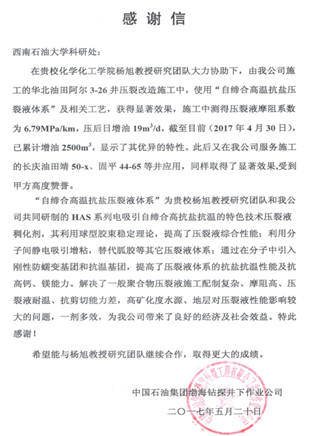 近日,西南石油大學科研處接到中國石油集團渤海鉆探井下作業公司發的感謝信,信中感謝我校化學化工學院楊旭教授研究團隊,在對方公司華北油田阿爾3-26井壓裂改造施工中,使用的“自締合高溫抗鹽壓裂液體系”及其相關增油降水技術,成功解決了低產低效油田開發難度大的問題,為油田上產穩產做出了貢獻,特此感謝!感謝信如下: