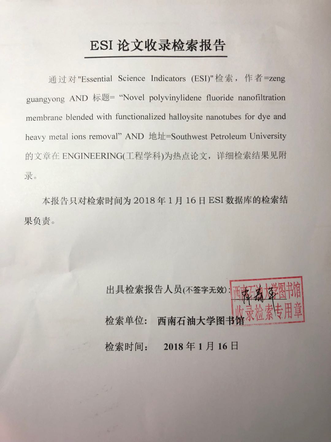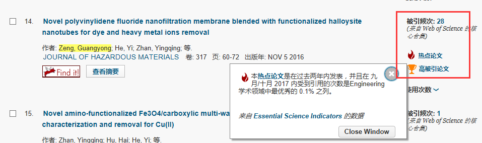 根據(jù)美國基本科學指標(ESI,Essential Science Indicators)數(shù)據(jù)庫最新統(tǒng)計數(shù)據(jù)顯示,我校化學化工學院2015級博士生曾廣勇發(fā)表的學術(shù)論文“Novel polyvinylidene fluoride nanofiltration membrane blended with functionalized halloysite nanotubes for dye and heavy metal ions removal”同時入選全球“Engineering”學術(shù)領(lǐng)域ESI熱點論文(Hot Papers,前0.1%)和高被引論文(Highly cited papers,前1%)。該論文于2016年發(fā)表在工程、環(huán)境學科領(lǐng)域國際權(quán)威期刊《Journal of Hazardous Materials》上(JCR一區(qū),IF=6.065),西南石油大學為第一作者單位,通訊作者為我校化學化工學院何毅教授。截至目前,該論文被引用次數(shù)已達33次(Google學術(shù)數(shù)據(jù))。這是我校目前唯一進入ESI工程學學科前0.1%的熱點論文,同時該論文也是何毅課題組近一年在該領(lǐng)域的第三篇高被引論文,標志著我校在工程學領(lǐng)域的研究成果具有一定的國際學術(shù)前沿影響力,對于提升我校國際聲譽和世界一流學科的建設(shè)具有較好的支撐作用。