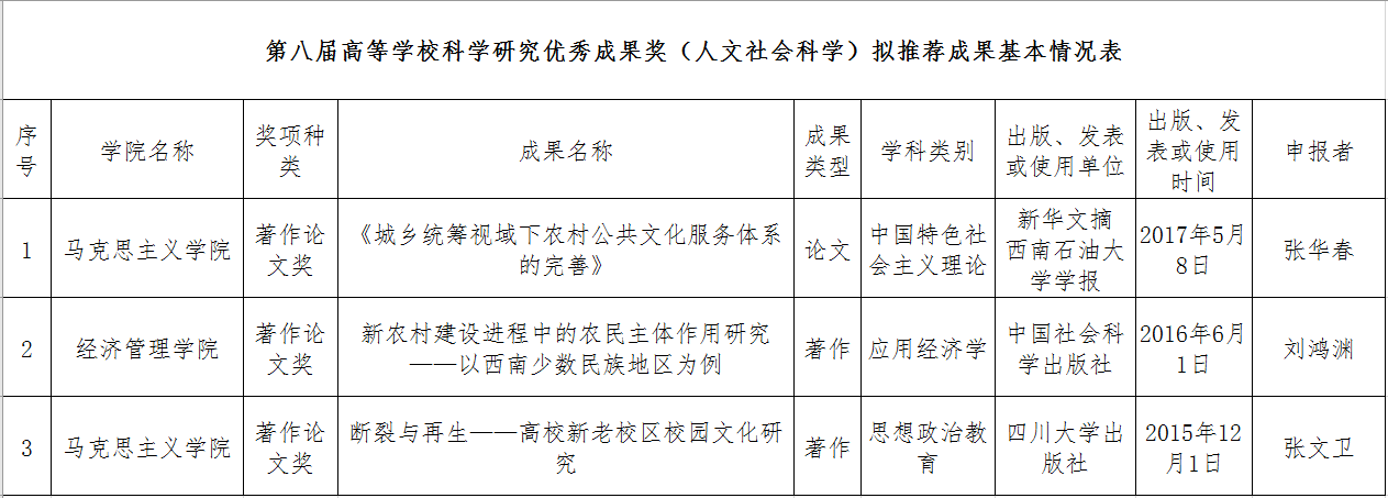 根據(jù)“教育部辦公廳關(guān)于第八屆高等學(xué)校科學(xué)研究優(yōu)秀成果獎(jiǎng)(人文社會(huì)科學(xué))申報(bào)工作的通知”(教社科廳[2019]1號(hào))和四川省教育廳相關(guān)要求,經(jīng)學(xué)院推薦、科研處審核、校外專家評(píng)審三個(gè)環(huán)節(jié),我校擬推薦《城鄉(xiāng)統(tǒng)籌視域下農(nóng)村公共文化服務(wù)體系的完善》等3項(xiàng)成果申報(bào)第八屆高等學(xué)校科學(xué)研究優(yōu)秀成果獎(jiǎng)(人文社會(huì)科學(xué))。現(xiàn)將擬推薦成果予以公示,公示期為2019年3月14日-20日。如有異議,請(qǐng)?jiān)诠酒趦?nèi)以實(shí)名形式向科研處反映或面談。