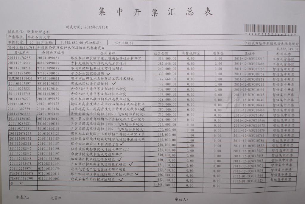 現將塔里木油田項目到款集中開票有關項目通知附后,請有關老師把合同復印件、項目結算單于2月29日前交科研處。(表里打勾可以不交材料)