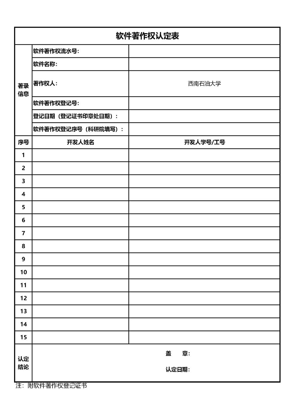 請下載附件填寫“軟件著作權認定表”與軟件著作權登記證書一并打印后到科研院成果管理部(辦公樓504室)辦理認定。