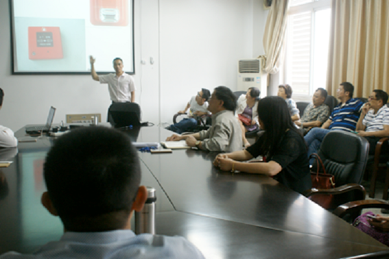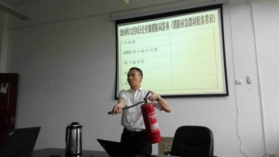 張廣生主任首先結合近年來高校實驗室發生的一系列火災爆炸事故,分析了實驗室可能存在的災害隱患。隨后為老師們講解了手電筒、ABC類干粉滅火器、燃氣報警器、煙感器、防煙面具等消防器材的用途及使用方法。結合具體火災案例,告知了大家一些消防常識和誤區,講解了正確的火場逃生與自救方法,呼吁大家居安思危、防患于未然。