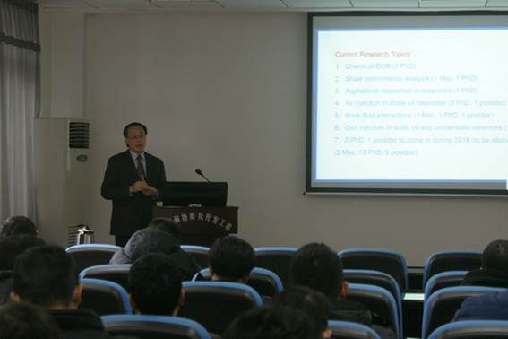 近日,實驗室固定研究人員盛家平教授在國家重點實驗室學術報告廳做了系列學術講座,并就提高采收率、微觀滲流、酸化壓裂、儲層保護、致密油氣藏開發等內容與相關研究人員開展學科方向交流。12月22號、12月24號、12月28號、12月30號,盛家平教授在國家重點實驗室A403學術報告廳分別做了“Determine Horizontal and Vertical Permeabilities From Probe-Type Formation Tests”、“Mobility Control Requirement in Enhanced Oil Recovery Processes ”、“Foamy Oil Flow”、“Teaching and Research in an American University”等四場學術講座。盛教授介紹了探針式地層測試確定水平和垂向滲透率的2種方法、飽和度修正的驅替聚合物的流動性應小于或等于最小驅替相流動性的理論和現場應用、多孔介質泡沫油流動態過程數學模擬方法等。